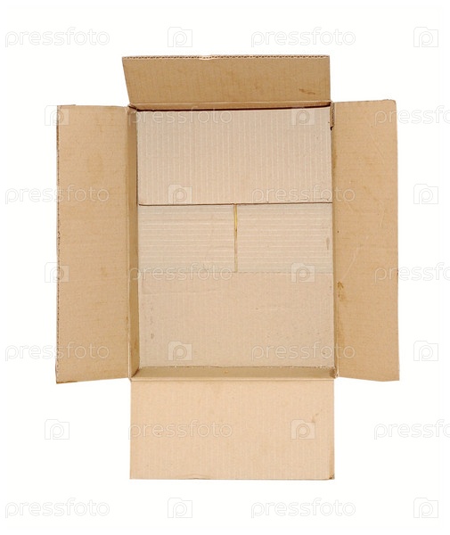 Открытая картонная коробка на белом фоне