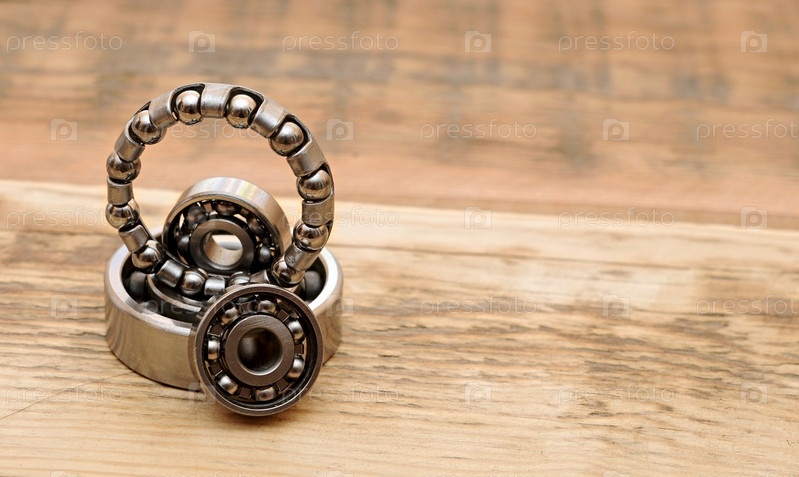 Стальные шарикоподшипники на деревянном столе. Пространство для вашего текста