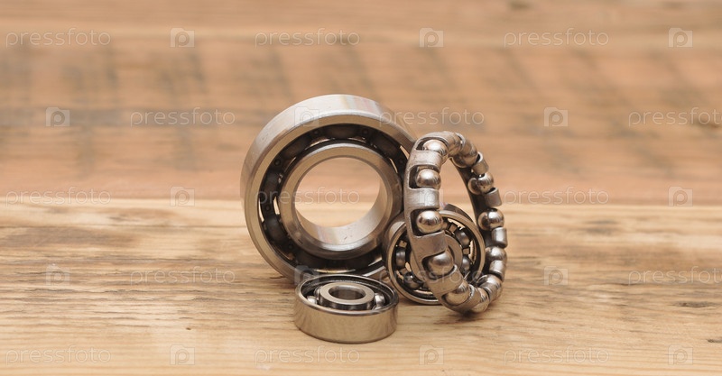 Стальные шарикоподшипники на деревянном столе. Пространство для вашего текста