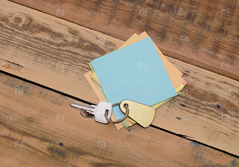 Стикеры и ключи с пустой биркой на деревянном фоне