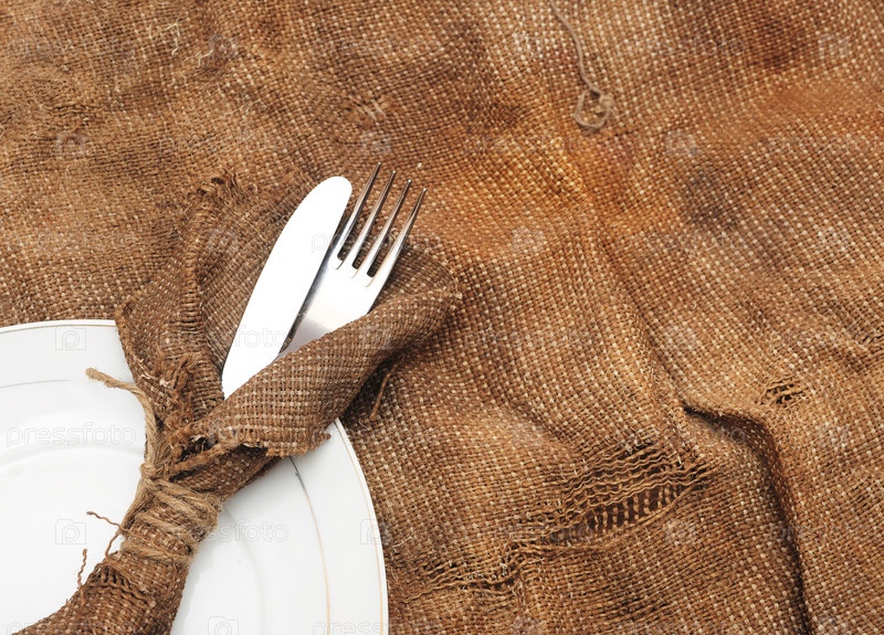 Пустая белая тарелка, вилка и нож на коричневой мешковине