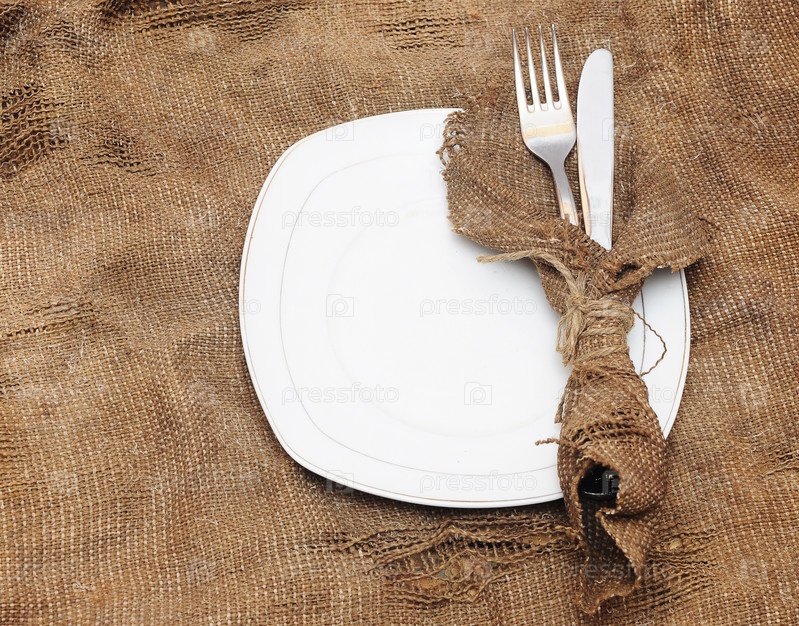 Пустая белая тарелка, вилка и нож на коричневой мешковине