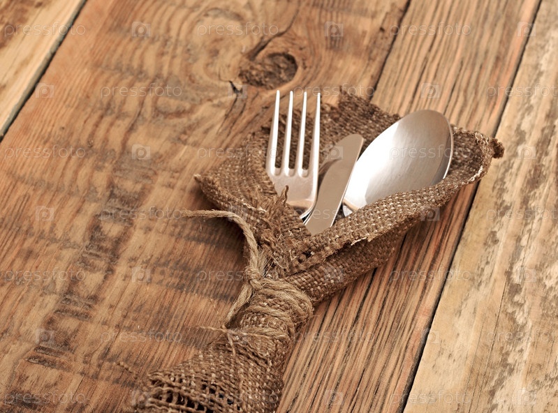 Нож и вилка в грубой старой мешковине на деревянном столе