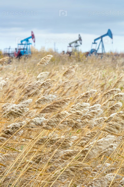 Тростник с нефтяными насосами на заднем плане