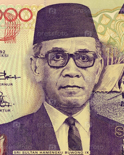 Шри Султан Хаменгу Бувоно IX (1912-1988) на купюре в 10000 рупий 1992 года из Индонезии Первый губернатор района Джокьякарта, девятый султан Султаната и Джокьякарты и второй вице-президент Индонезии во время правления Сухарто