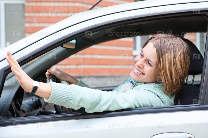 Красивая молодая блондинка машет рукой из автомобиля