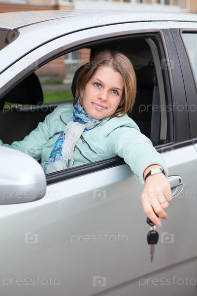 Радостная женщина сидит в машине с ключом зажигания