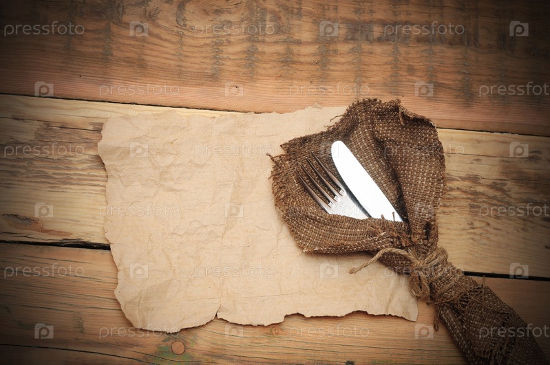 Нож и вилка в грубой старой мешковине на чистом листе бумаги на деревянном столе