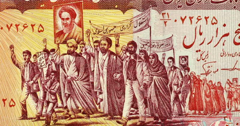 Мулла во главе марша, люди держат в руках плакаты Хомейни. Купюра 5000 риалов 1983 года из Ирана