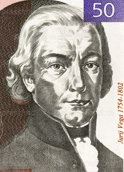 Портрет Юрия Вега (1754-1802) на банкноте в 50 толарев 1992 года. Словенский математик, физик и артиллерийский офицер