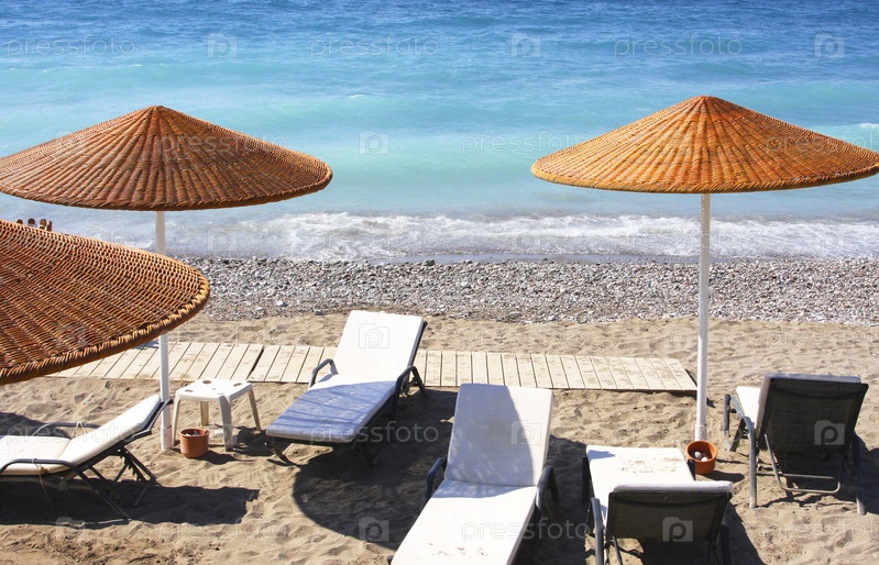 Шезлонги и зонтики на песчаном пляже
