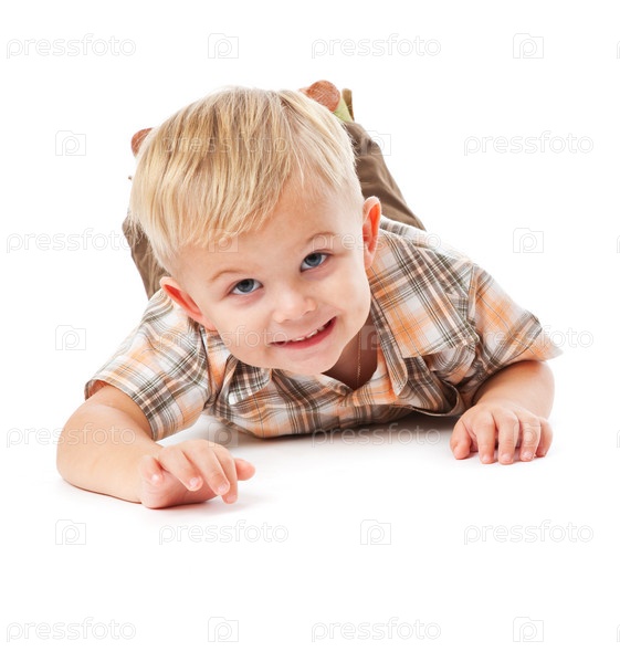 Маленький мальчик лежит на животе и смотрит в камеру на белом фоне