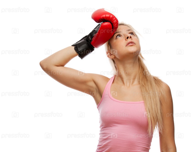 Уставшая женщина в боксерских перчатках