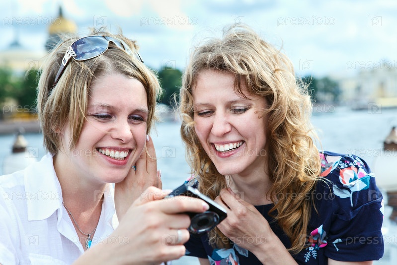 Две веселые женщины смотрят на экран фотокамеры