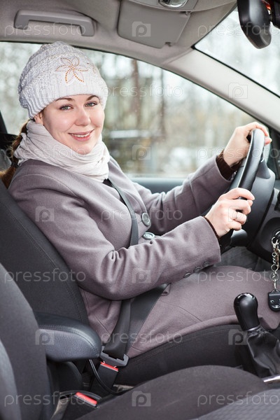 Женщина в теплой одежде за рулем автомобиля