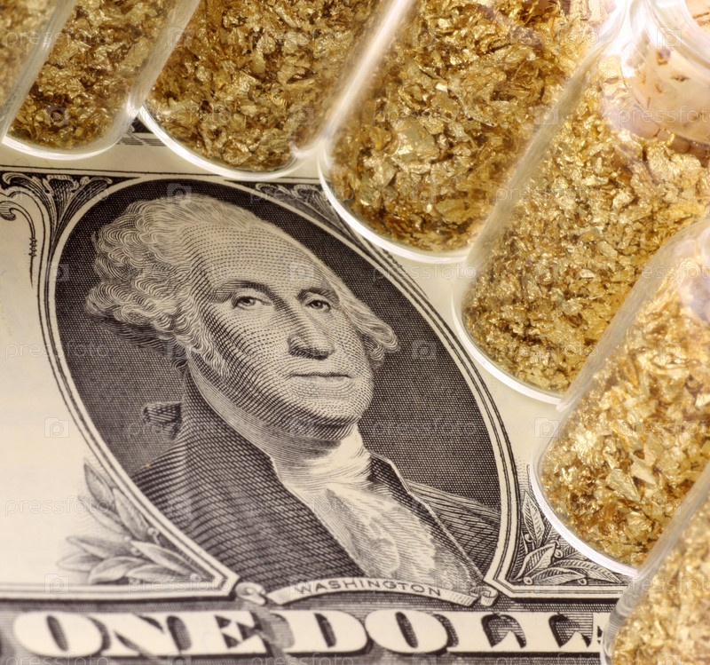Золото в колбах и банкнота в один доллар