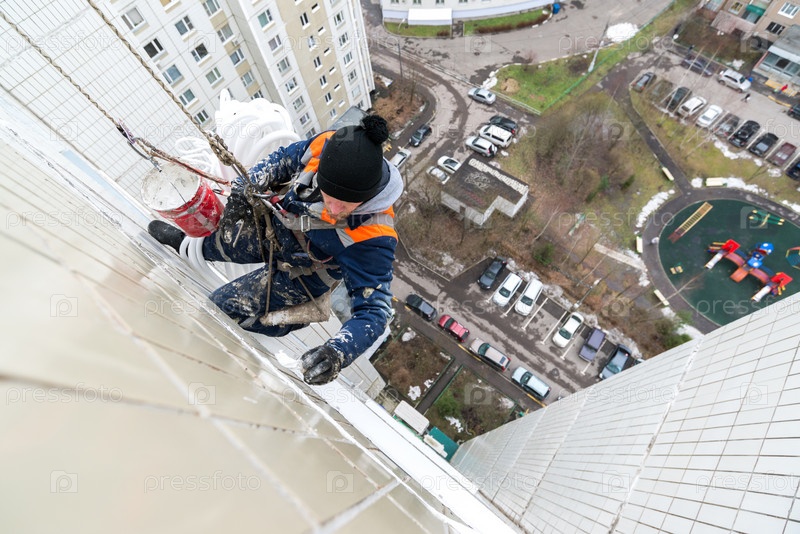 Промышленный альпинист на фасаде жилого дома