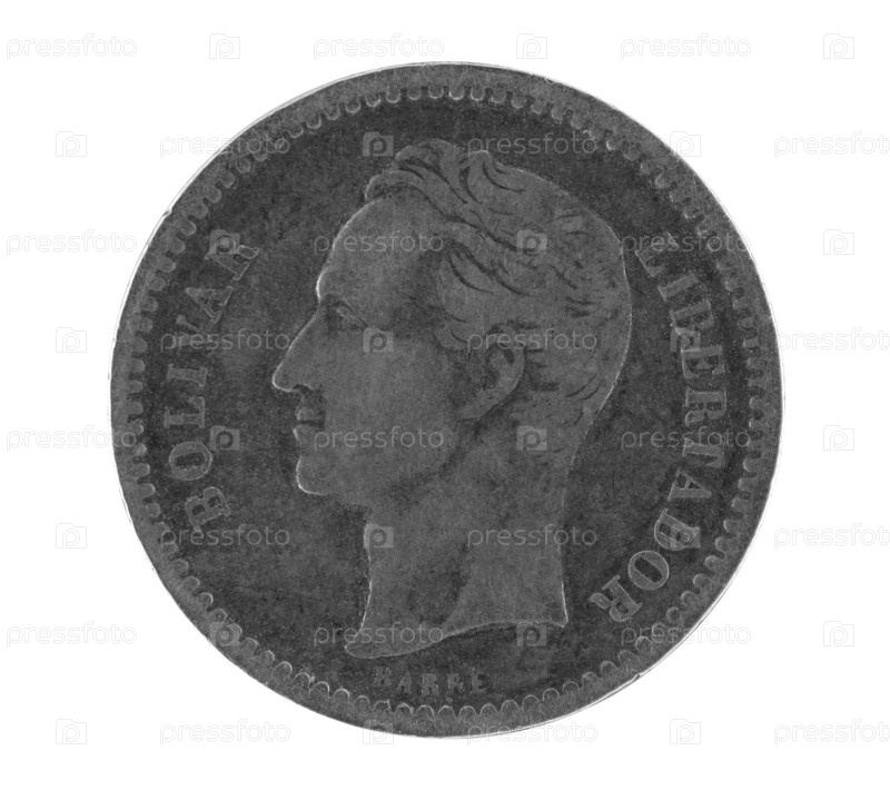 Боливар на старой серебряной монете из Венесуэлы на белом фоне