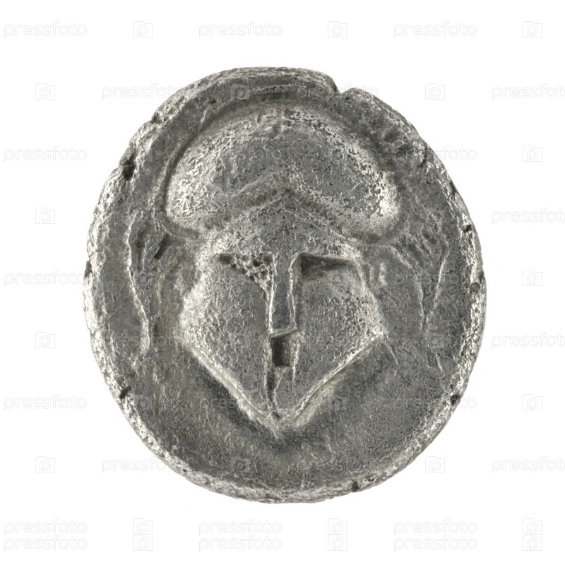 Древняя греческая монета 350 г. до н.э.на белом фоне