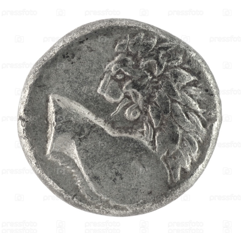 Лев на древней греческой драхме 350 г. до н.э. на белом фоне