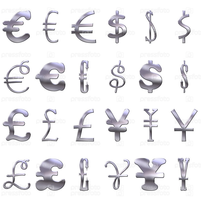 Серебряные символы валюты на белом фоне