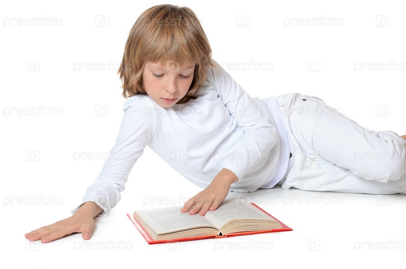 Девочка читает книгу, изолировано на белом фоне