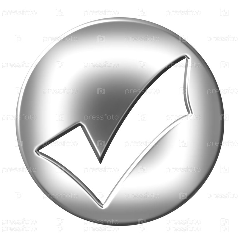 Серебряная кнопка с символом "галочка" на белом фоне