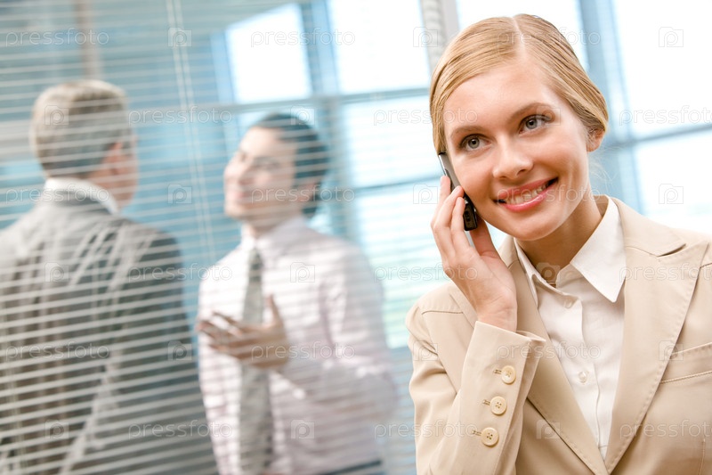Портрет счастливой бизнес-жены, звонящей по сотовому телефону на фоне взаимодействующих мужчин