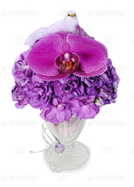 Композиция из орхидей, гортензии и синих птиц в стеклянной вазе, изолированная на белом фоне