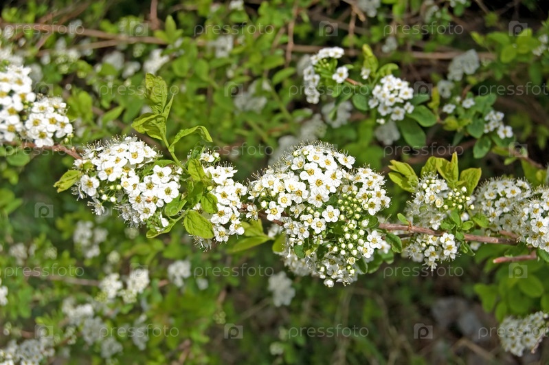 Цветущие белые соцветия кустарника на фоне зеленых листьев