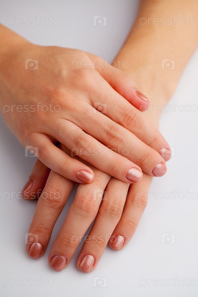 Руки молодой женщины с розовым лаком