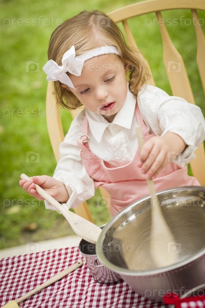Очаровательная маленькая девочка играет в шеф-повара