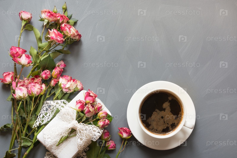Букет из розовых роз и чашка кофе