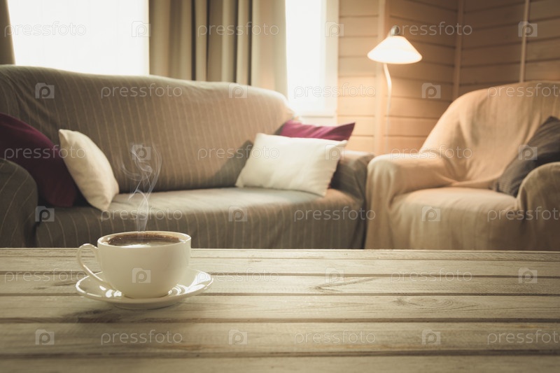 Горячий кофе на столе в современной гостиной