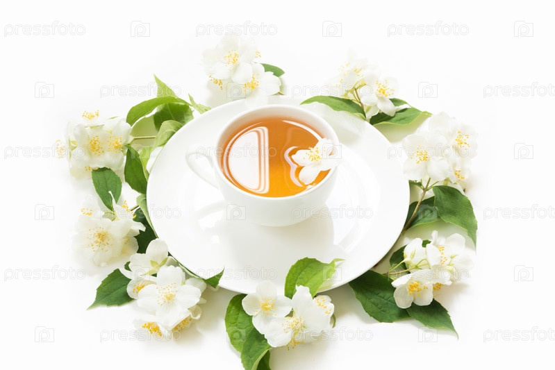 Жасмин листья и цветы вокруг чашки зеленого чая на белом фоне