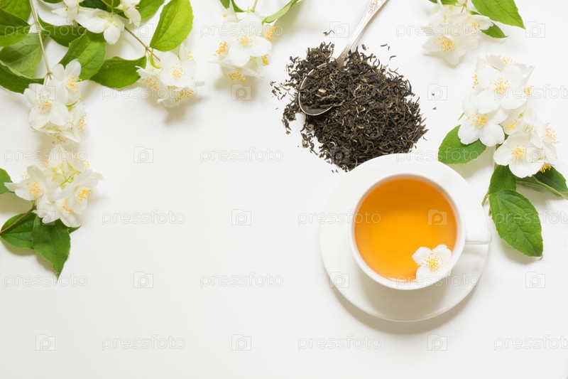 Жасминовые цветы и чашка зеленого чая на белом фоне