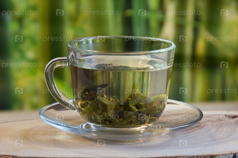 Чашка с зеленым чаем и зеленых листьев
