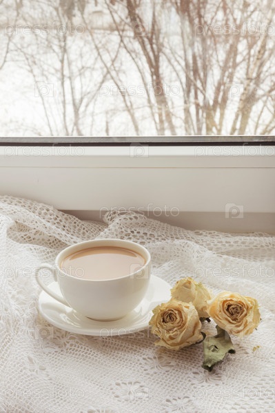 Чашка кофе с молоком на подоконнике с сухими розами