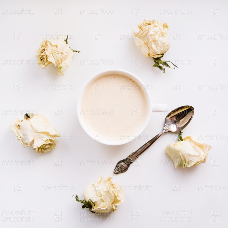 Натюрморт с чашкой кофе и сухими белыми розами