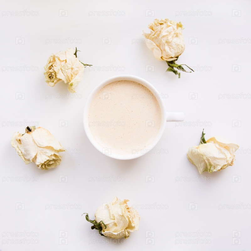 Натюрморт с чашкой кофе и сухими белыми розами