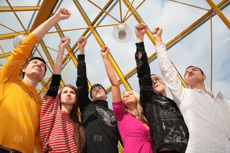 Группа молодых людей с поднятыми вверх кулаками