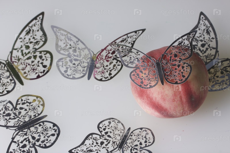 Спелый сочный персик украшен бабочками