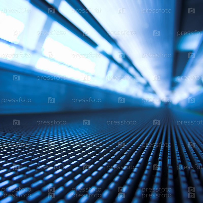 Синий подвижный эскалатор в офисном холле с перспективным видом