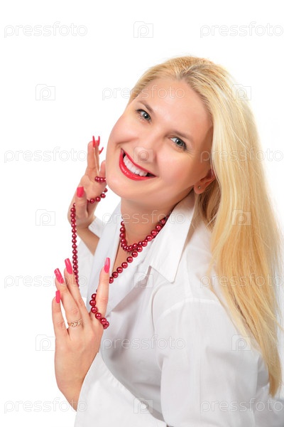 Красивая блондинка в красных бусах
