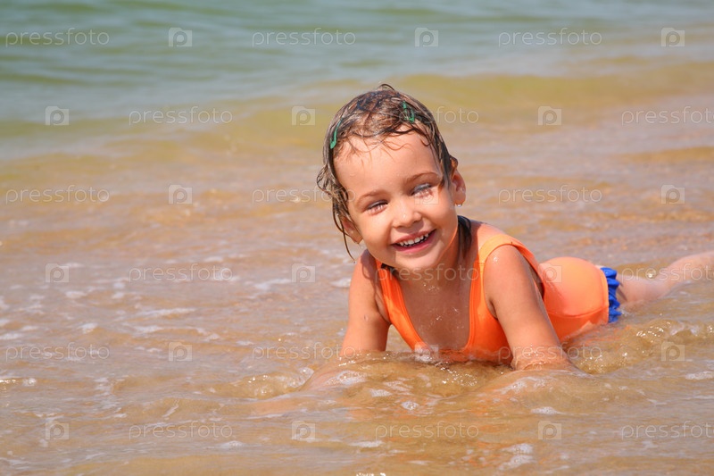 Девочка лежит в воде на берегу