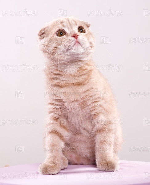 Бежевый кот смотрит вверх, пригнув уши, на белом фоне