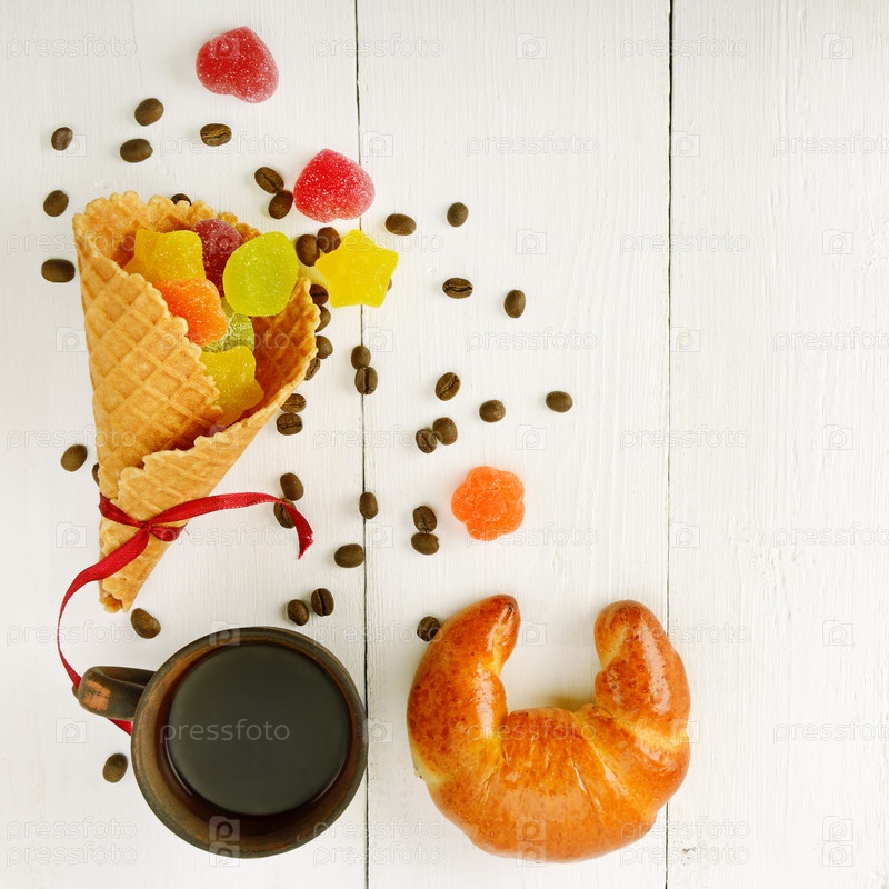 Чашка кофе, круассан, вафли и мармелад