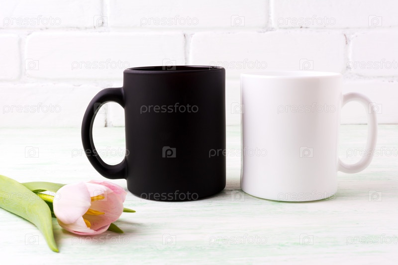 Белая и черная кружки с розовым тюльпаном