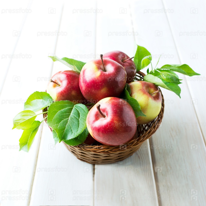 Красные яблоки с зелеными листьями