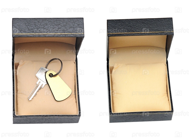 Ключ с пустой биркой в черной подарочной коробке, изолированный на белом